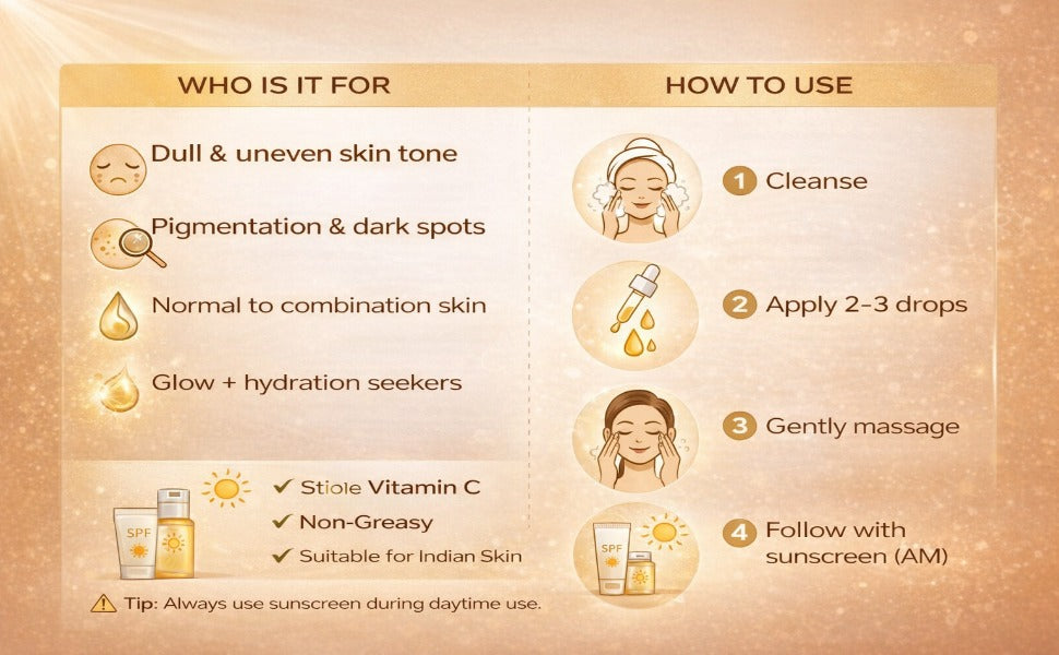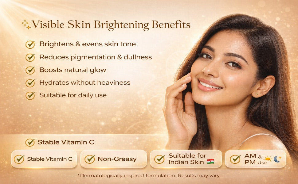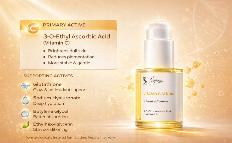 This serum uses 3-O-Ethyl Ascorbic Acid, a stable and advanced Vitamin C derivative. It delivers effective brightening and glow with less irritation compared to pure L-Ascorbic Acid, making it suitable for Indian skin tones.